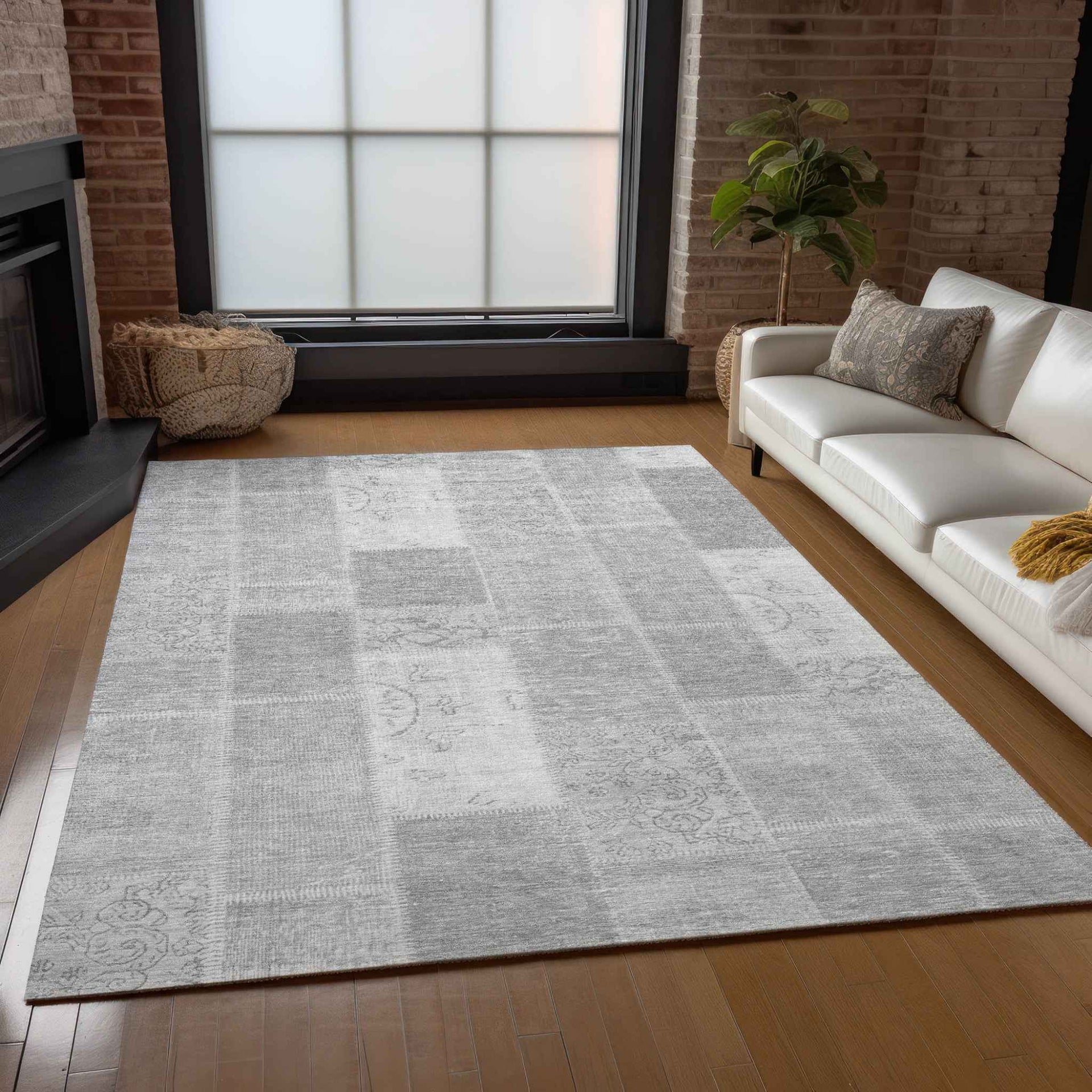 This 9-foot x 12-foot silver gray and graphite patchwork washable indoor outdoor area rug, is a great way to add warmth to a room. This rectangle shaped rug features a patchwork design that will work well both indoors or out. A classic shape marries with good looking design for your living room, hall, bedroom, porch, patio, or poolside. Ideal for outdoor spaces or high traffic areas with kids and pets, this rug is made from heavy duty polyester that is stain resistant to help repel water, dirt, and stains. Versatile in use, durable, and easy to maintain, this rug is an ideal solution to add a decorative and inviting touch to your indoor or outdoor space. 108-inch h x 144-inch w x 0.19-inch d.